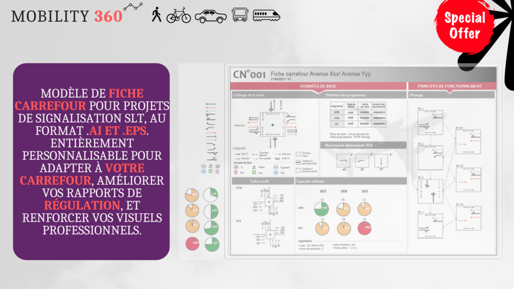 Modèle de fiche carrefour pour projets de signalisation SLT, au format .AI (Adobe Illustrator) et .EPS. Entièrement personnalisable pour adapter à votre carrefour, améliorer vos rapports de régulation, et renforcer vos visuels professionnels.