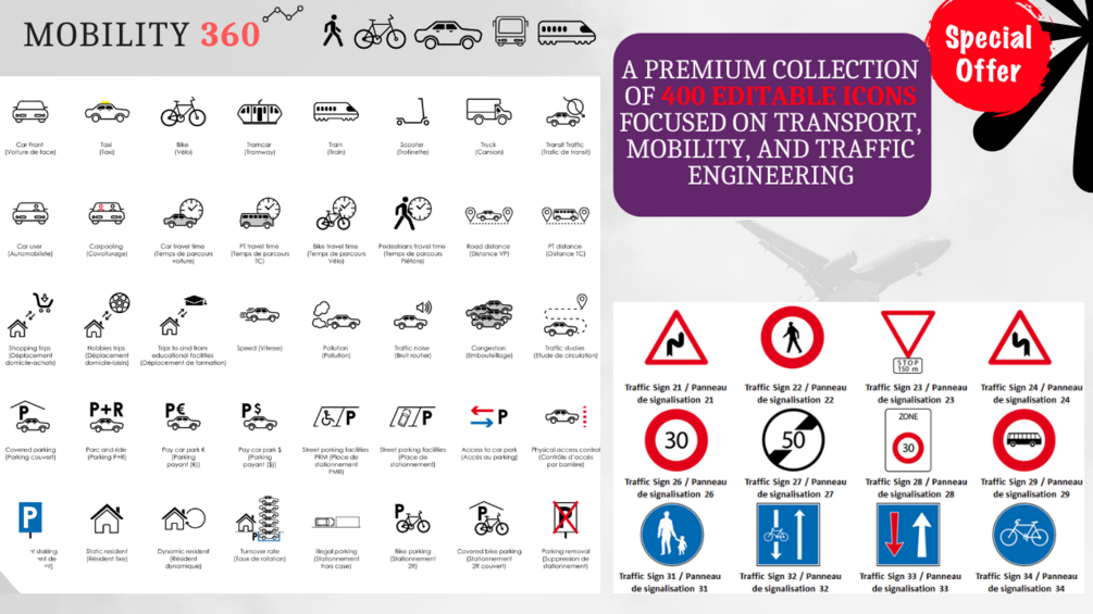 A premium collection of 400 editable icons focused on transport, mobility, and traffic engineering—designed by experts, for professionals. Delivered in PowerPoint format with bilingual concept descriptions (EN/FR).